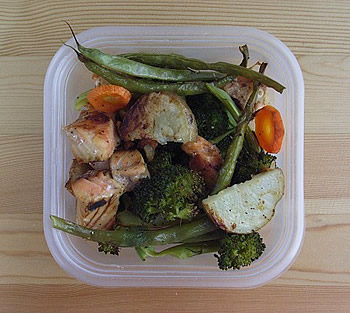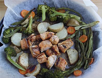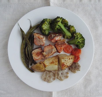 オーブンではこんな感じで。サケを真ん中におくと、その旨みが全体に行き渡っていいですよ。