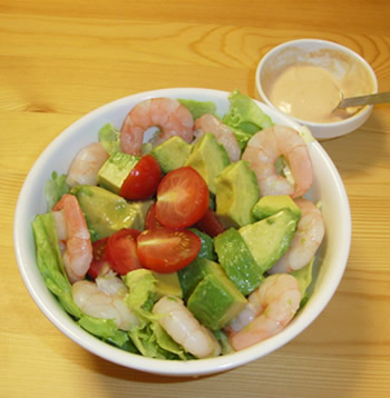 5.器にレタスを敷き、ゆで卵、えび、アボガド、プチトマトを盛り、3のドレッシングを回しかける。