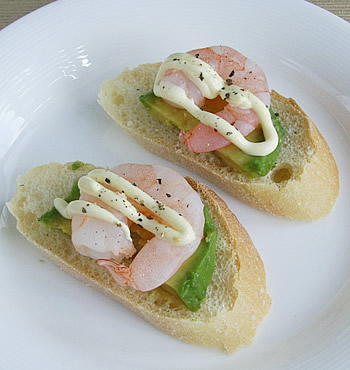3.バケットにアボガドとむきえびをのせ、マヨネーズをかけて、塩・こしょうをふる。