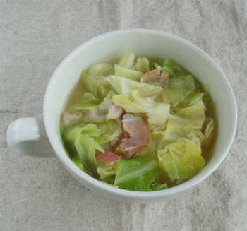 2.フライパン(鍋でもOK)にバターを熱し、ベーコンを炒め、カリカリになったら、キャベツを投入。軽くいためて、水、顆粒コンソメを入れて、ふたをして煮込む。キャベツが柔らかくなったら、塩、こしょうで味を調える。