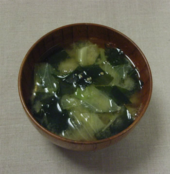 2.鍋に水200cc、煮干、だしの素を入れ、火にかける。沸騰したら、レタス、わかめを入れて、再び沸騰したら、味噌を溶き入れる。