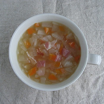 2.鍋に全ての材料を入れて、野菜が十分に柔らかくなるまで、ひたすら煮込む(30分以上)最後にベーコンを入れて、一煮立ち。最後に塩、こしょうで味を調える。