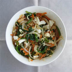 2.鍋に湯をたっぷり沸かし、塩少々を入れる。まず、もやし(1分)を入れて、1分経ったら、ざるですくう。(最初からざるに入れててもOK)続けて、にんじん(2分)を入れて、2分経ったら、ざるですくい、ほうれん草(1分)を最後にゆでる。それぞれ、水気を切り、ほうれん草は、5cm長さに切る。