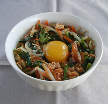 4.器にごはんと、3をのせ、卵黄を入れる。