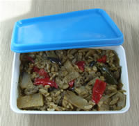 5.3に、なすと、たけのこと、牛肉を入れて、煮る。