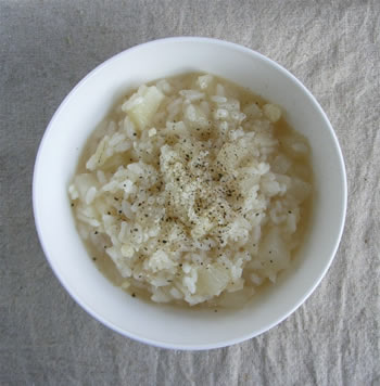 2.鍋にオリーブ油を熱し、たまねぎを入れてゆっくり炒める。たまねぎがしんなりしたら、白ワインを入れてアルコール分を飛ばし、大根、じゃがいも、水1カップ、顆粒コンソメを加えて煮る。