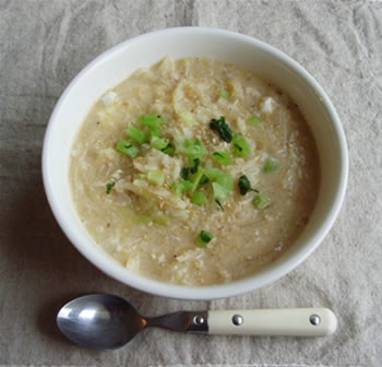 2.鍋にだし汁とかつおぶしと大根を入れて、火をかける。大根が柔らかくなったら、酒、味噌を溶き入れる。ごはんを入れて、一煮する。最後に、卵を割りいれて混ぜる。