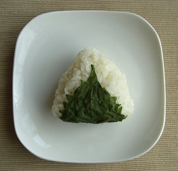 2.塩少々を手に付け、おにぎりをにぎって、巻きます。