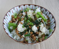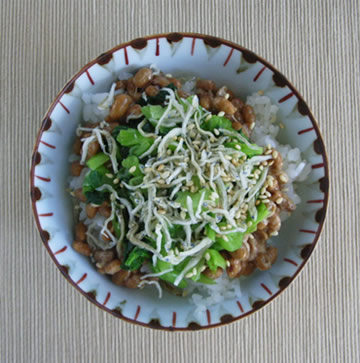 2.器にご飯を盛り、納豆、小松菜、ちりめんじゃこをのせ、ごま、しょうゆをかけて、よく混ぜながら食べる。