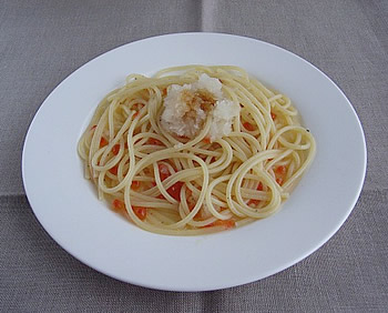 3.茹で上がったスパゲティを2のボウルに入れて和え、皿にもり、大根おろしをのせて、しょうゆをかける。