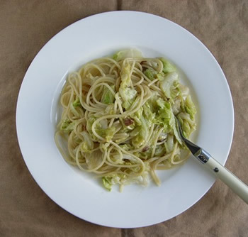3.フライパンにオリーブ油を熱し、弱火にしてにんにくを炒める。色づいたら、アンチョビーを加えてカリカリにし、キャベツも入れて軽く炒めたら、火からおろす。