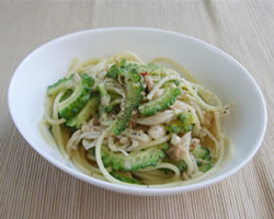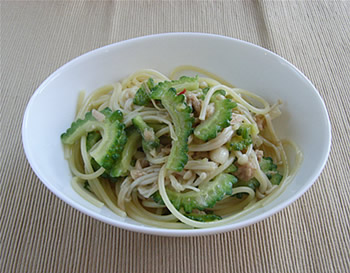 3.フライパンにオリーブ油とにんにくと、たかのつめを熱し、香りが出たら、えのきをいため、しんなりしたら、ゴーヤを入れてゴーヤが透き通るまで炒める。最後に油を切ったツナ缶を入れて、炒める。