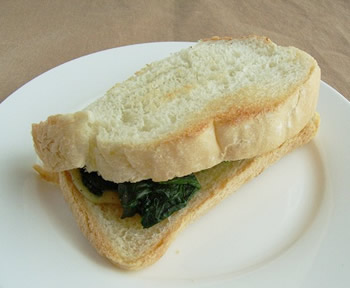 2.パンにバターを塗り、スライスチーズと、ほうれん草を上にのせて、塩、こしょうを振り、オーブントースターで焼く。