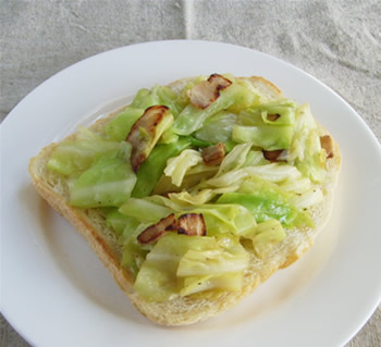 2.フライパンにオリーブ油を熱し、ベーコンを炒めて、焼き目がついたら、キャベツを入れて軽くいためる。その後、水大さじ2位入れて、ふたをして蒸し焼きにする。キャベツの芯の部分も柔らかくなったら、火を止めて、塩・こしょうで味を調える。