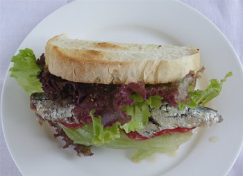 3.パンの上に、レタス、トマト、サーディンをのせて、はさんで食べる。