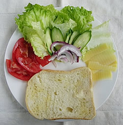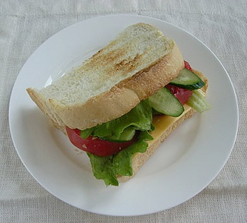 4.スライスチーズ、レタス、トマト、きゅうりをはさみ、塩をふる。