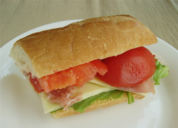 3.バケットの下の断面に、バター(またはフレンチマスタード)を塗り、レタス、生ハム、スライスチーズ、アボガド、トマトをはさむ。
