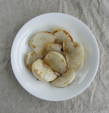2.フライパンにオリーブ油を熱し、かぶを弱火でじっくり焼く。両面に焼き目がついたら、皿に盛り、塩をふる。