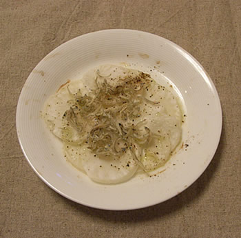 2.かぶの上に、塩、こしょう、じゃこをのせ、オリーブ油、酢をかける。お皿ごと、オーブントースターに入れ、じゃこがカリカリになるまで焼く。