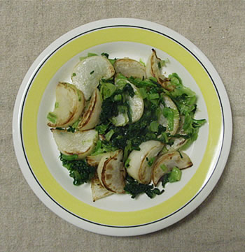かぶをくし切りにして、オリーブ油で焼いただけ。後は、作り置きしておいた、かぶと大根の葉の塩漬けを最後に入れて、炒め合わせただけ。これだけで十分美味しいのです。