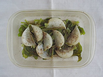 2.耐熱容器に、オリーブ油と、かぶを並べいれ、塩・こしょうをふり、ふた(またはラップ)をして、電子レンジで4~5分加熱する。