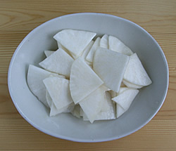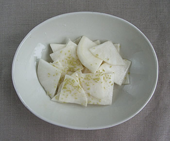 1.かぶは皮をむき、薄いいちょう切りにし、塩をかけて15分程おく。