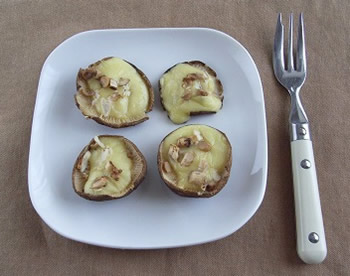 2.しいたけを逆さにして、4等分にちぎったチーズをそれぞれにのせる。その上に、輪切りにした軸をのせる。