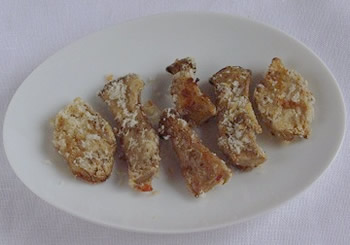 2、小麦粉と水を混ぜ、エリンギにからめてから、粉チーズとパン粉をまぶす。
