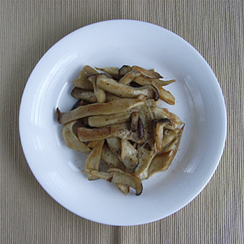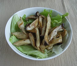 1.エリンギは、下の硬いところを切りおとし、縦に裂く。(包丁で切るよりも、手で裂いた方が、味がなじみやすいのです)