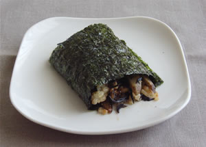 「ごぼうとひじきのきんぴら」を使った、玄米のり巻き。