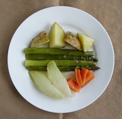 1.野菜をそれぞれ適宜切り、耐熱容器に入れる。オリーブ油と塩を入れて混ぜ、ふたをし、電子レンジで15分加熱する。