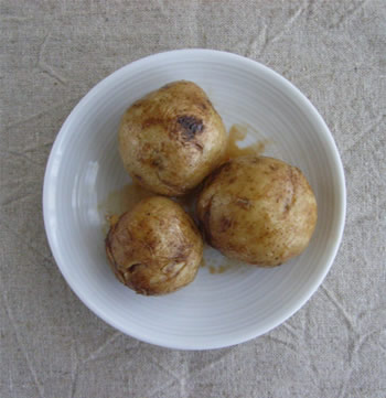 1.じゃがいもは皮付きのまま、厚手の鍋に重ならないように並べ入れ、かぶる程度の水を入れ、ふたをして強火にかける。煮立ったら、中弱火にし、15分程蒸しゆでにする。