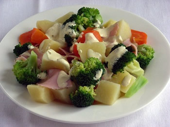 5.野菜と、ハムを器に盛り、ソースをかける。