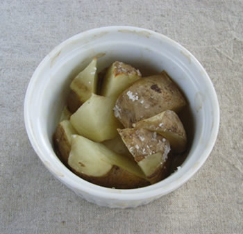 2.耐熱容器に、水気のついたままじゃがいもを入れ、粗塩と、オリーブ油をふる。