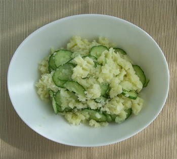 3.じゃがいもの皮を剥いて、熱いうちにボールに入れ、フォークで細かくつぶす。バターと牛乳と粉チーズ、塩、こしょうを加えてよく混ぜ、きゅうりを加えてひと混ぜして、器に盛る。