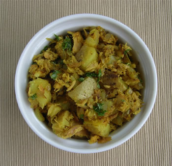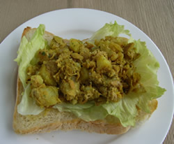 2.フライパンにオリーブ油を熱し、玉ねぎのみじん切りと、ターメリックを炒める。そのあと、じゃがいもと、ツナ缶を入れて、炒め、塩、こしょうで味を調える。カレー粉とマヨネーズは好みで。