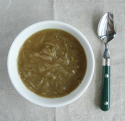 3.同じ小鍋にバターを溶かし、玉ねぎを軽く炒める。水、コンソメを入れて、沸騰させる。沸騰したら、ふたをして弱火でじっくり煮る。(30~1時間位)