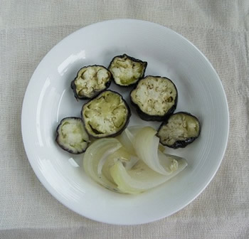 1.なすは輪切り、玉ねぎは1~2cm厚さのくし切り。耐熱容器に入れて、塩、オリーブ油をかけて混ぜ、端開けラップをして、電子レンジで10分以上加熱するだけ。