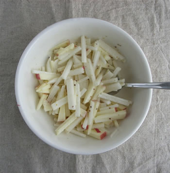 1.大根は皮をむいて3cm長さの細切りにする。リンゴも同様に切る。