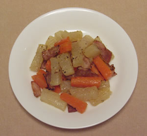 ベーコンの旨みがしみこんで、甘くやわらかくなった大根とにんじんが美味しい!