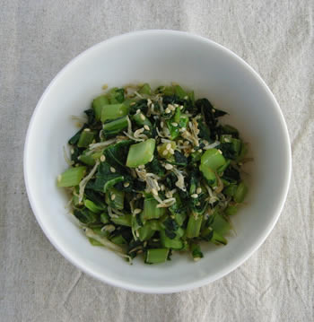 2.フライパンにサラダ油を熱し、大根の葉を炒め、油が回ってしんなりしたら、じゃこを加えていため合わせ、しょうゆと酒で調味し、ごまをふる。