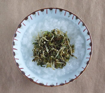 2.フライパンにサラダ油少々を熱して、大根葉を炒める。油が回ってしんなりしたら、ちりめんじゃこを加えていため合わせ、酒を入れさらに炒める。火を止めてから、しょうゆを入れて混ぜ、ごまをふる。