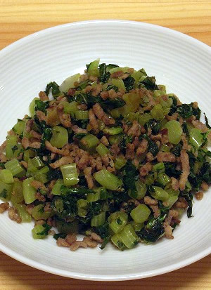 3.フライパンを熱してごま油をいれ、豚ひき肉を炒める。肉の色が完全に変わったら、大根の葉を加えて炒め合せる。