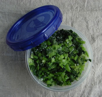 3.大根の茎が柔らかくなったら、流水にさらして、冷まし、水気を切り、小口切りに切る。それに塩をまぶしてもんだら、密封容器に入れて冷蔵庫の中へ。