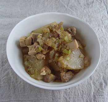 2.鍋に大根としょうがと、かぶる程度の水を入れて煮る。沸騰したら、鶏肉も入れて、蓋をして20~30分煮る。途中で水がなくなりそうになったらさし水をする。