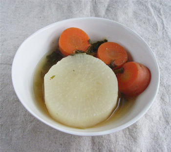 3.鍋に昆布を敷いて、大根とにんじんをのせ、水をひたひたに入れ、塩を振り、ふたをして火にかける。沸騰したら弱火にして、30分ほど似る。