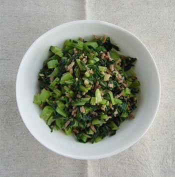 3.大根の葉と、塩を加えてさらに炒め、全体に油が回ったら、酒、みりん、しょうゆをそれぞれ汁気を飛ばしながら、順に入れて、炒め煮にする。