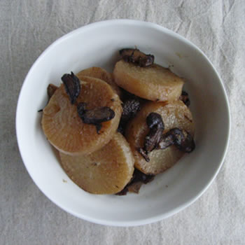 2.鍋に油を熱して、大根を軽く炒め、続けて干ししいたけも入れて炒める。大根にしっかりと焼き色が付いたら、干ししいたけの戻し汁を入れて、中火で20分~30分煮る。(途中水が足りなくなったら足す)