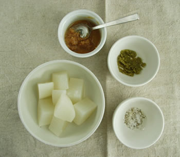 1.大根は厚めの輪切りにし、皮をむいて4つに切る。