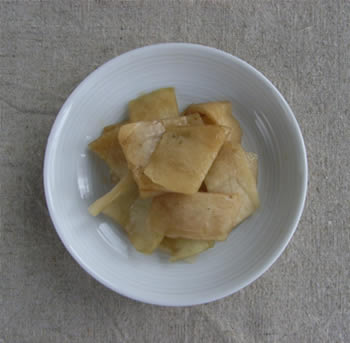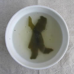 副産物のスープ。大根を煮た後の汁を捨てずに、塩・こしょうや、ごま油を入れて、頂きます。昆布も食べちゃいましょう!
